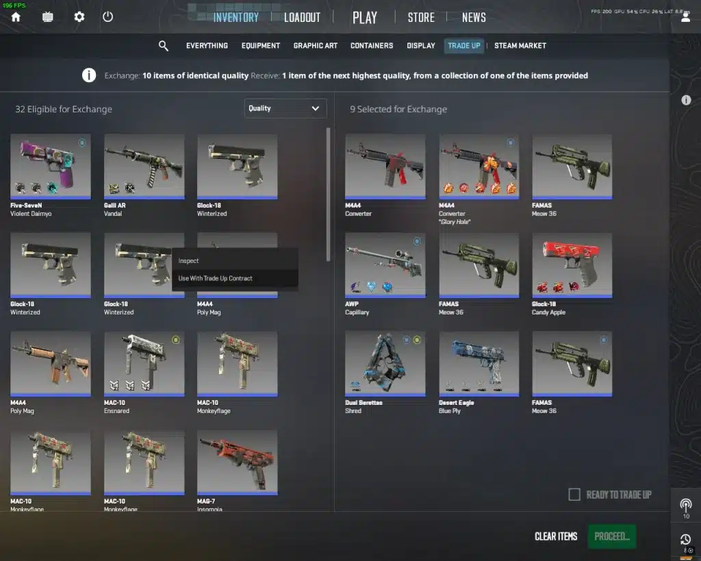 A Trade Up Contract is a feature in CS2 that lets you combine 10 skins of the same rarity into one skin of the next higher rarity. It’s essentially a gamble, as the result is randomly selected from the collections of the skins you use. With proper planning, however, you can skew the odds in your favor and even turn a profit.